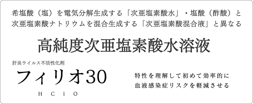 - 医療器具用次亜塩素酸弱酸性水溶液「フィリオ30」 (有効塩素濃度 200 ppm、pH 6.0 ± 0.5)